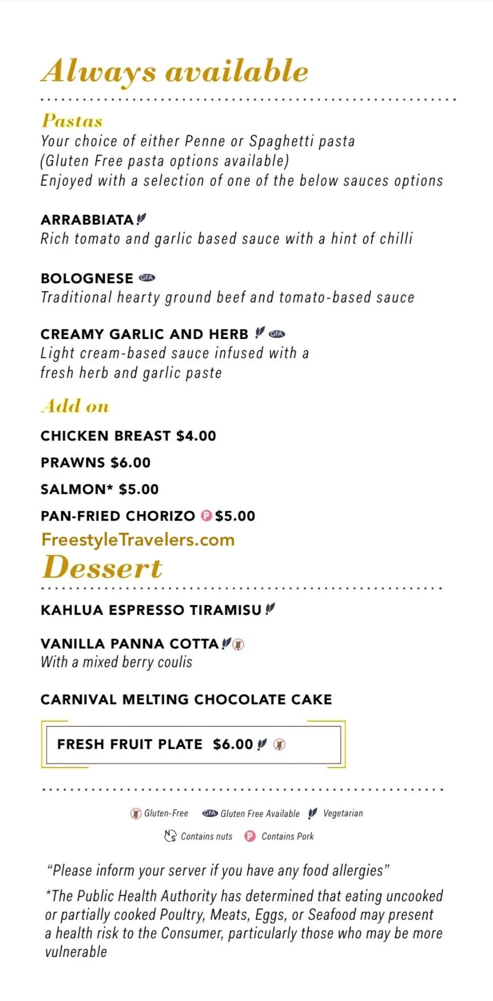 The Angelo’s Restaurant menu focuses on classic Italian recipes prepared with simple ingredients and traditional flavors. Menu selections rotate throughout the cruise, giving guests variety across multiple evenings. However, several pasta dishes remain consistently available, including beef lasagna, vegetarian lasagna, and build your own pasta with sauces such as bolognese, creamy garlic and herb, and arrabbiata. Guests can choose penne or spaghetti, with gluten free pasta options available, and add proteins like chicken breast, prawns, salmon, or chorizo for an additional charge.