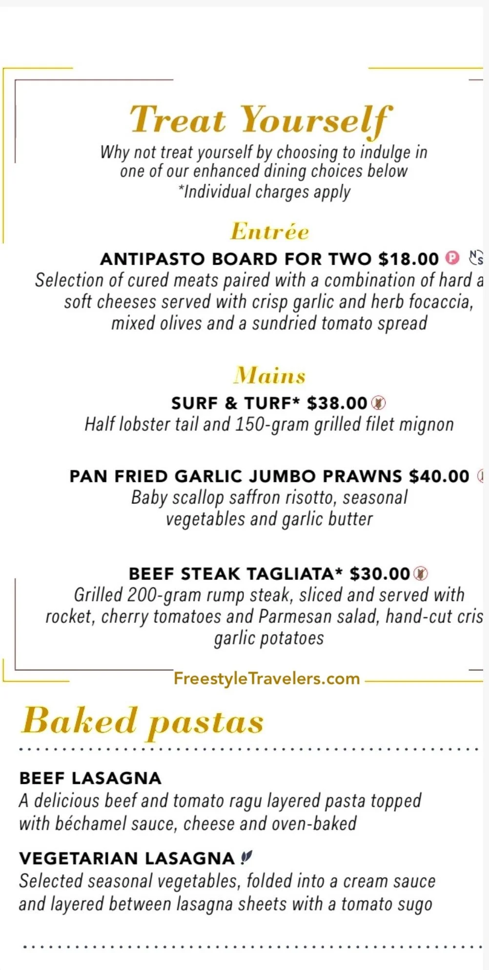 For an additional fee, enhanced dining options are available. These may include an antipasto board for two with cured meats and cheeses, surf and turf with lobster tail and filet mignon, pan fried garlic jumbo prawns with saffron risotto, and beef steak tagliata served with a rocket Parmesan salad and crispy garlic potatoes.