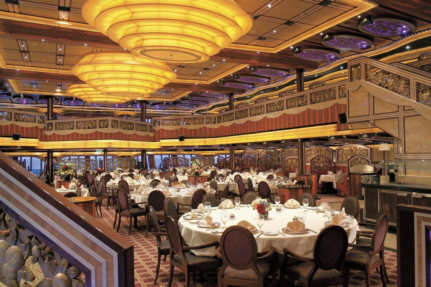 Port day breakfast is offered in the morning, while sea day brunch combines breakfast and lunch selections. Dinner service features multi-course menus with appetizers, entrees, and desserts that rotate nightly. These main dining rooms remain a core part of the dining experience for guests who prefer table service.