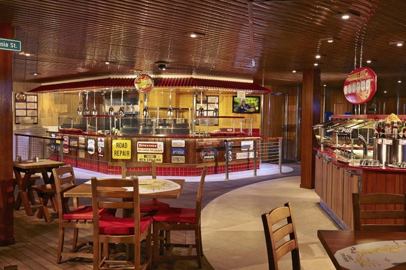 Guy’s Burger Joint, created in partnership with celebrity chef Guy Fieri, is open on sea days for lunch and dinner. Guests can order hand formed burgers and fresh cut fries, then customize their meal at the toppings bar.