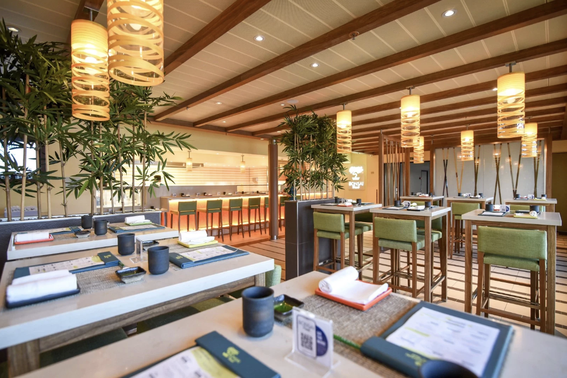 Bonsai Sushi offers sushi, sashimi, rolls, and other Japanese dishes for an additional fee. The restaurant is open for lunch on sea days and nightly for dinner. It is a top choice for guests looking for a quieter dining environment on Carnival Sunshine.