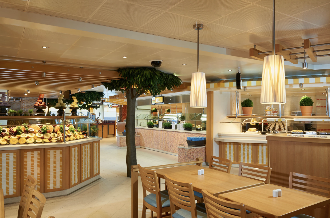 Lido Marketplace is the main buffet on Carnival Sunshine. It features a variety of stations offering breakfast, lunch, and dinner. Guests can find salads, hot entrees, desserts, and international dishes throughout the day. This buffet is ideal for travelers looking for flexible dining hours and a wide selection.