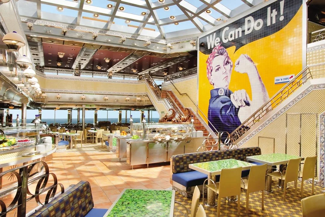 Rosie’s Buffet, named after Rosie the Riveter, is the main buffet restaurant on Carnival Valor. Open for breakfast, lunch, and dinner, it offers a rotating selection of hot entrees, salads, desserts, and international dishes. It is a popular choice on embarkation day and during port mornings.