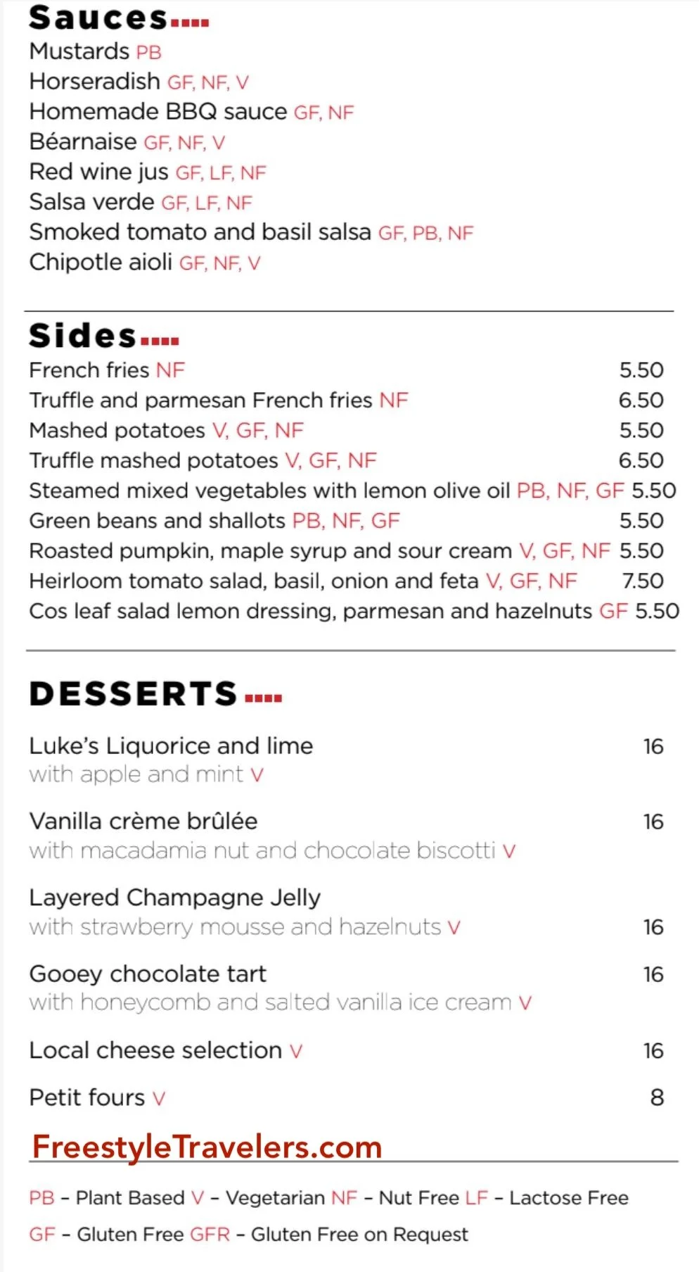 Desserts include Luke’s Liquorice and Lime with apple and mint, vanilla crème brûlée, layered Champagne jelly with strawberry mousse, gooey chocolate tart, local cheese selection, and petit fours.