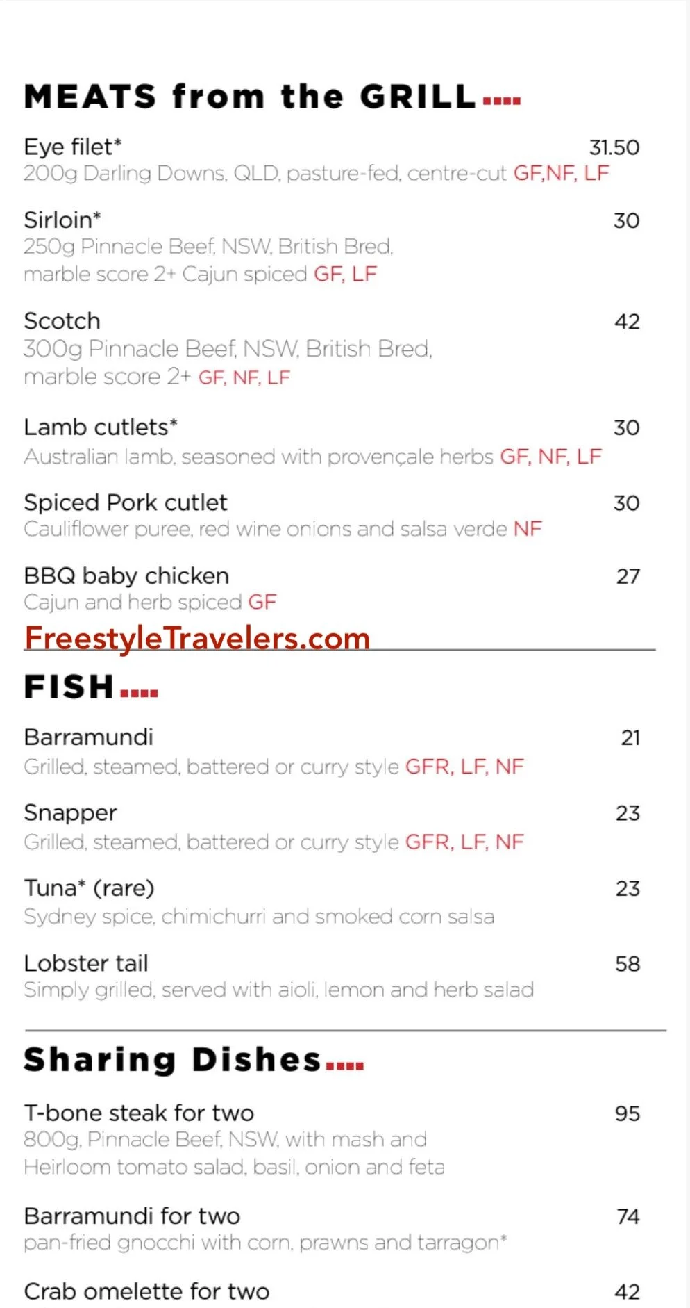 Seafood mains include barramundi prepared grilled, steamed, battered, or curry style, snapper, rare tuna with chimichurri, and grilled lobster tail. For larger groups, sharing dishes such as an 800 gram T bone steak for two, barramundi for two, and a crab omelette for two are available.