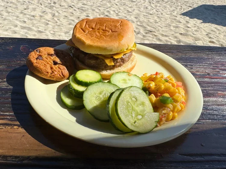 Lunch is served at two main locations on the island, with covered seating available near the food service areas. Seating is first come, and guests may eat at either location regardless of where they spend the day.