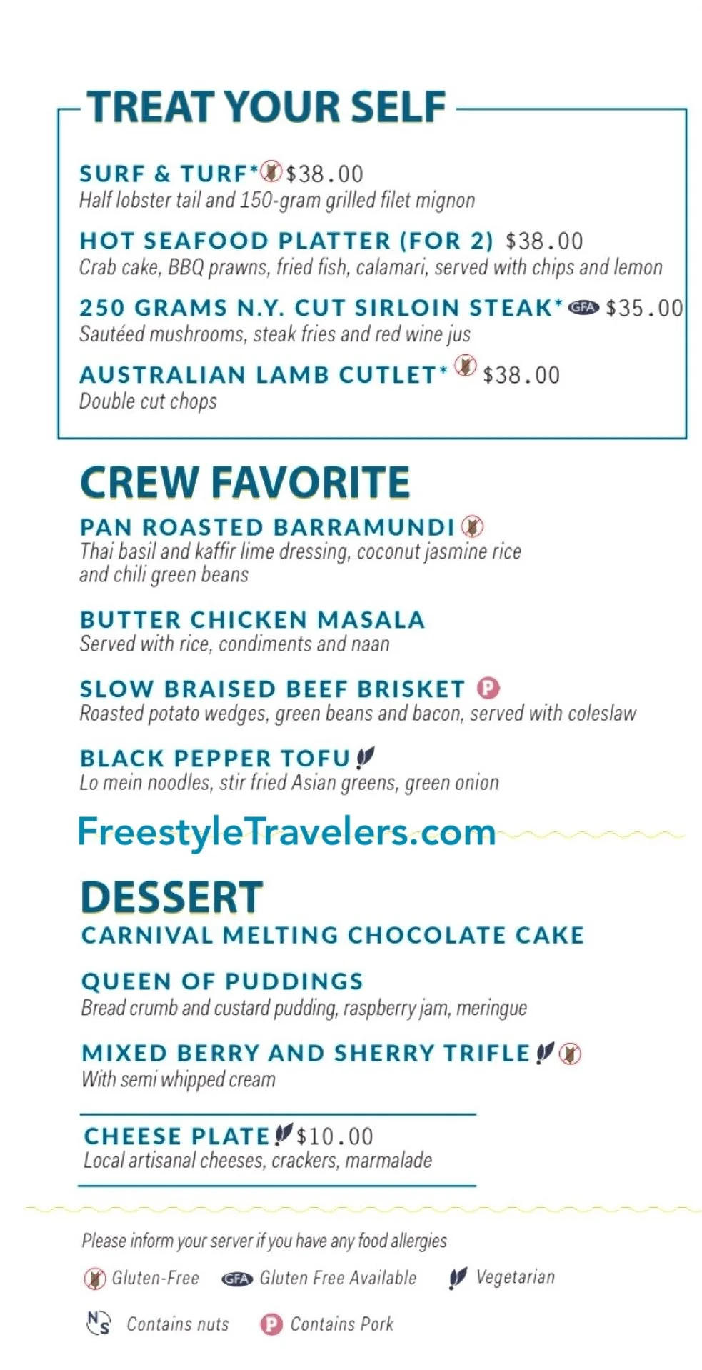 Desserts rotate nightly and often include Carnival melting chocolate cake, salted caramel tres leches cake, sticky date pudding, mixed berry trifle, banoffee pie, gelato pie, fresh fruit plate, and a cheese plate with crackers and marmalade.