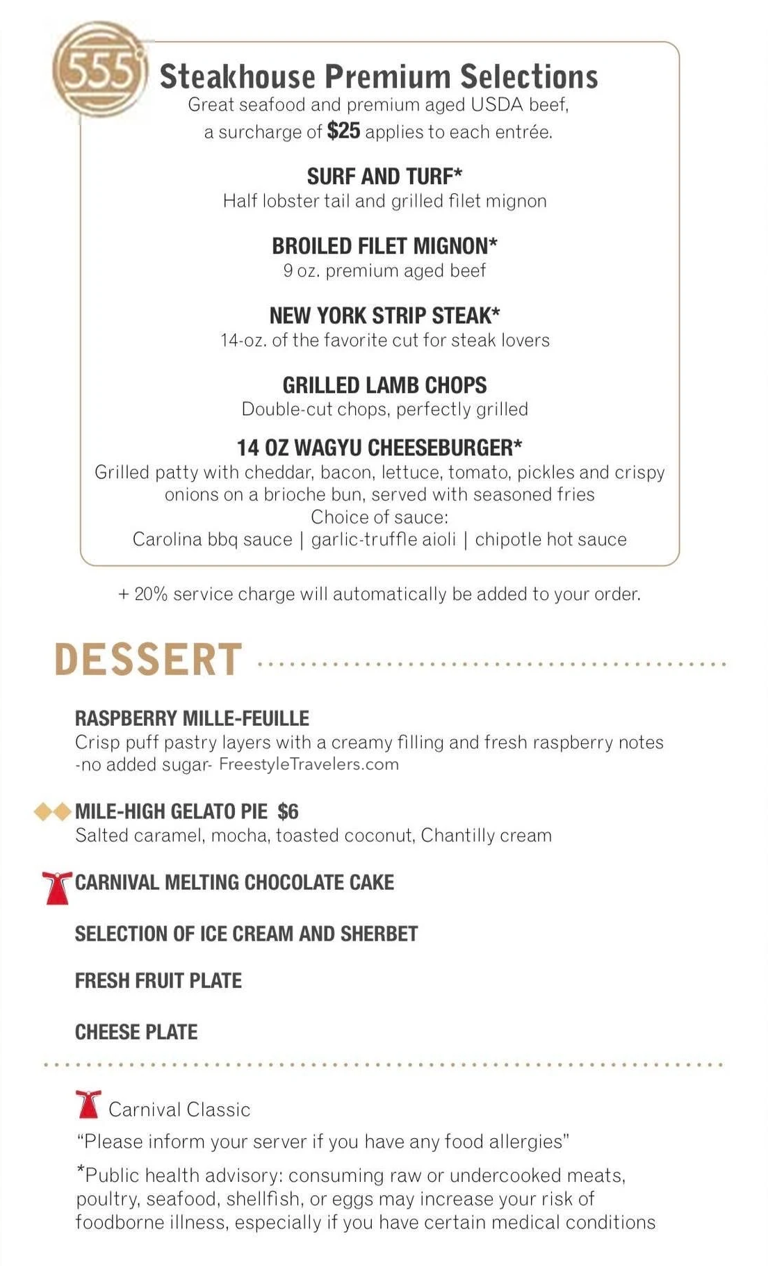 The Carnival Night 5 main dining room menu features a mix of seafood, meat, and vegetarian dishes across appetizers, entrées, and desserts. Starters include bisque, fried oysters, gazpacho, and salads. Entrées range from seafood pasta and fried fish to baked chicken, short ribs, and plant-based options. Steakhouse selections are available for a surcharge, and desserts include crème de pot, gelato pie, and chocolate cake.